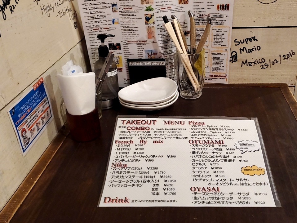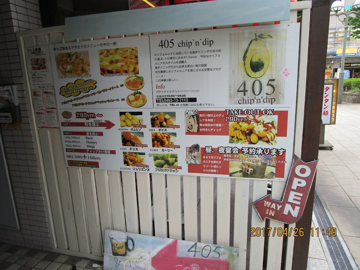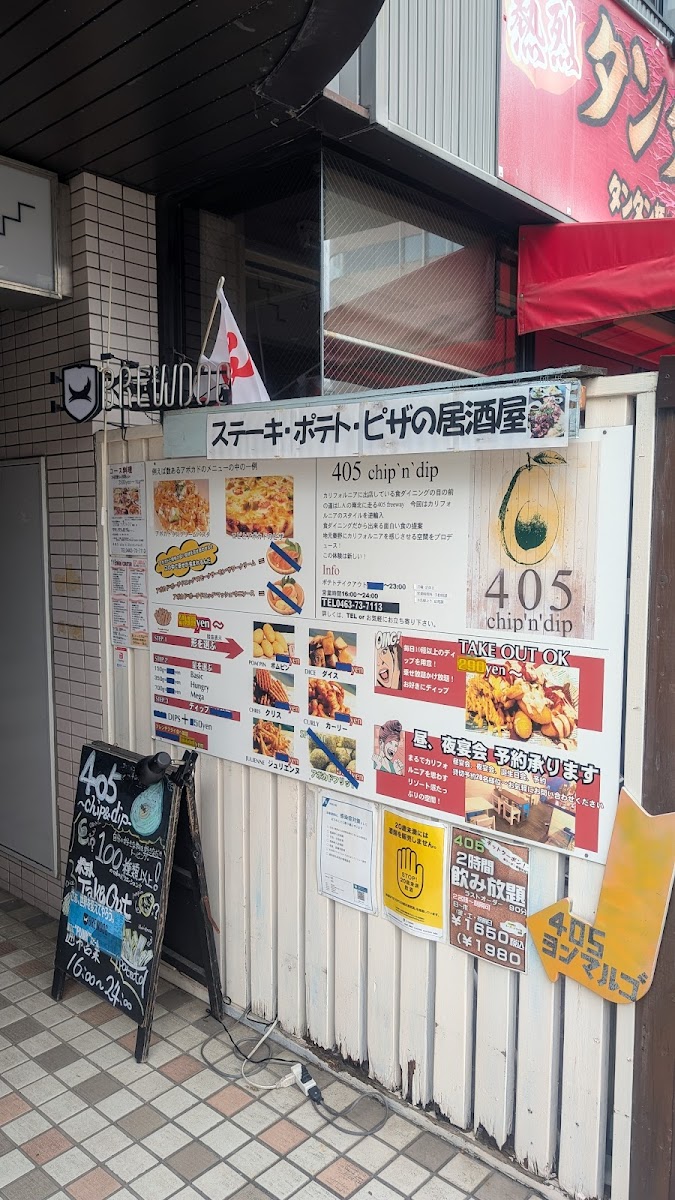 The menu at 405 Chip'n'dip California in Hadano offers a delightful variety of dishes and drinks, blending bold flavors with creative twists. For starters, French Fries come in interesting variations like Julienne, MIX Ahi-jo, and Avocado or MIX Nuts Pancakes. The Tapas section includes the savory combination of Honey, Gorgonzola, and Walnuts, alongside MIX Olives and CHEESE Mash. Pasta lovers can enjoy Shirasu Peperoncino or the more adventurous Wasabi BLACK Peperoncino. The Pizza menu features the classic Margherita, perfect for those craving a traditional Italian touch. For drinks, beer enthusiasts can choose from options like Asahi Super Dry Draft Beer, Blue Moon (bottle), and Punk IPA (bottle). The wine selection is equally impressive, with choices such as Beringer California Cabernet Sauvignon and Tala Monti Lume, complemented by sparkling options like the MIX Berry Sparkling. Cocktails are a highlight, offering signature drinks like the Homemade Ginger Vodka Moscow Mule, 405 Straw Hat, and MIX Berry Mojito. Additional offerings include refreshing Highballs and a variety of bottled wines for those seeking a more refined drink experience. Overall, the menu is a vibrant mix of comfort food, bold drinks, and unique combinations, perfect for those looking for a memorable dining experience.